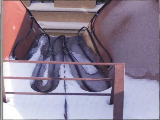 Самые распространенные ошибки проектирования кабельных систем обогрева сводятся к неверному выбору мощности греющего кабеля. Недогрев опасен тем, что ведет к росту наледи. Взять хотя бы широко распространенную металлочерепицу. Нити кабеля недостаточной мощности, уложенные в ложбинах «волны», провоцируют рост сосулек на краях гребней. Весьма проблематичными зонами являются ендовы. Так, сложная ендова требует в среднем 100 Вт на погонный метр, соответственно одной ниткой кабеля здесь не обойтись. Нетрудно подсчитать, что саморегулируемый кабель в данном случае окажется намного эффективней - одна нить «самрега» NELSON LT-210 дает порядка 60 Вт во льду против 20 Вт постоянной мощности большинства резистивных кабелей. Для водосточной трубы кроме ее диаметра определяющими параметрами являются и протяженность, и объем водосбора на одну точку. Если этими данными пренебречь, то расчетной мощности окажется недостаточно. Еще один нюанс -чем длиннее водосточная труба, тем больше необходимость усиливать обогрев входной воронки и нижней части трубы. В этих местах укладываются дополнительные петли кабеля. При нехватке тепла в этих местах идет максимальное образование льда. Обогрев капельника требует максимального внимания, так как именно его конструкция определяет необходимое количество ниток кабеля и их мощность. Чем сложнее форма, тем больше возможность образования сосулек, Самый простой капельник при маленьком угле уклона кровли, небольшом расстоянии до желоба-водоотбойника требует одной нитки снизу, страхующей от сосулек. При возможности схода снежной «доски» приходится добавлять нитку, очищающую верхнюю кромку. При усложнении формы и увеличении размеров капельника может потребоваться дополнительная зона обогрева. Даже достаточно простые формы капельников подразумевают несколько вариантов расположения нитей кабеля. С нестандартными формами еще сложнее - неверное положение нитей может способствовать образованию ледяных заторов. В целом же усложнение формы капельника приводит к усложнению монтажа системы обогрева, а в отдельных случаях к увеличению требуемой мощности. Что касается желобов—разуклонок на старых зданиях, необходимо учитывать высоту стенки, угол уклона кровли, возможность образования и схода снежных . досок. Все это влияет на потребную мощность и на расположение кабеля. Если крыша состоит из нескольких ярусов, то снег с верхних ярусов со временем переваливает на нижние. Большую массу снега практически не растопить, особенно когда существуют ограничения по мощности. В подобных ситуациях задача сводится к избежанию роста сосулек. На «теплых» кровлях бывает необходимо укладывать «змейку» по кромке. Это весьма дорогое решение, так как оно существенно увеличивает расход кабеля и соответственно стоимость системы. Но иногда оно является единственным, кроме варианта переделывать всю кровлю. По протяженности кабеля «змейки» на небольших участках могут оказаться наравне со всеми другими обогреваемыми частями. Причем возникает и другая проблема. Если снег сходит лавинами, то рано или поздно «змейки» повредятся. В таких случаях крыша нуждается в установке снегозадержателей. Это в большей степени касается гладких металлических кровель, на кровлях с верхним присыпным слоем снег, как правило, держится и не сход